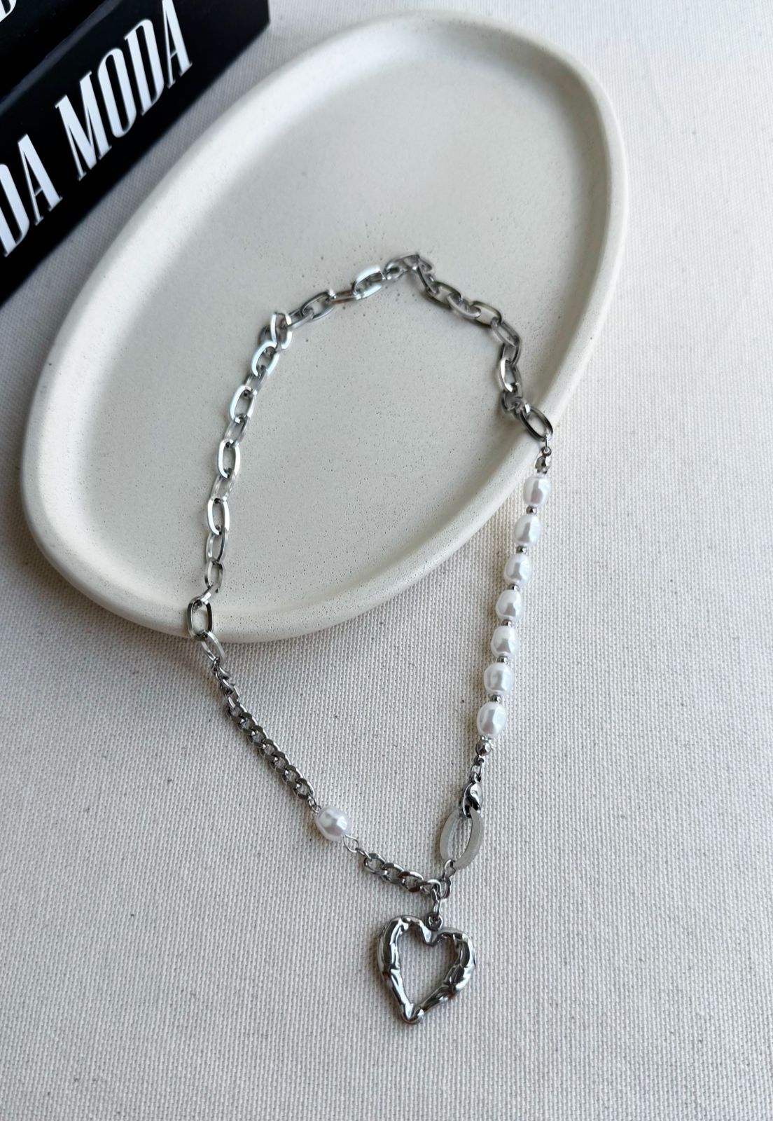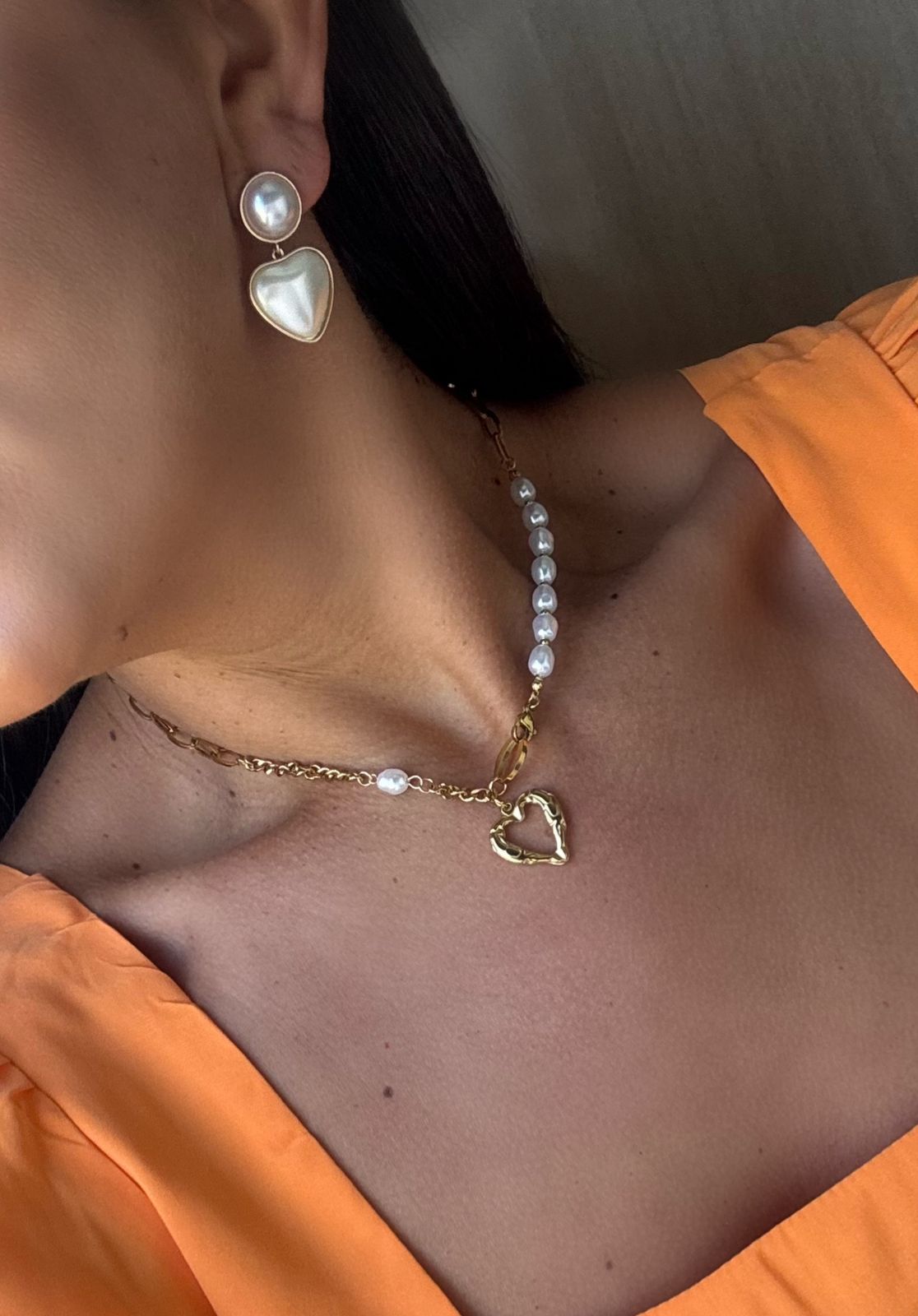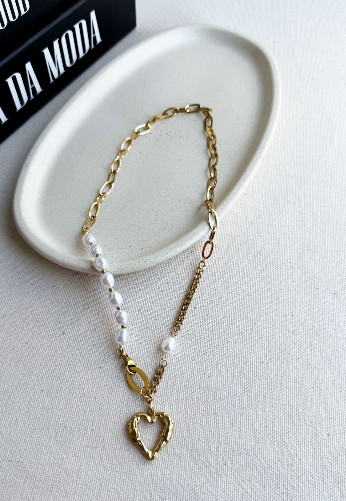 Colar confeccionado em aço inox de alta qualidade, um material conhecido por sua durabilidade e resistência ao uso diário, que não escurece com facilidade e mantém o brilho por muito mais tempo. O design desta peça traz uma combinação elegante de correntes com diferentes formatos de elos, que se entrelaçam com delicados detalhes em pérolas artificiais, proporcionando um visual sofisticado e moderno ao mesmo tempo. O ponto de destaque é o pingente em formato de coração vazado, que acrescenta um toque romântico e estiloso, tornando o colar versátil e perfeito para compor desde looks casuais até produções mais refinadas. Por ser um acessório atemporal, é uma excelente escolha para quem deseja agregar charme e personalidade às composições do dia a dia. Disponível nas cores dourado e prateado, este colar é ideal para quem busca elegância, praticidade e durabilidade em uma única peça.