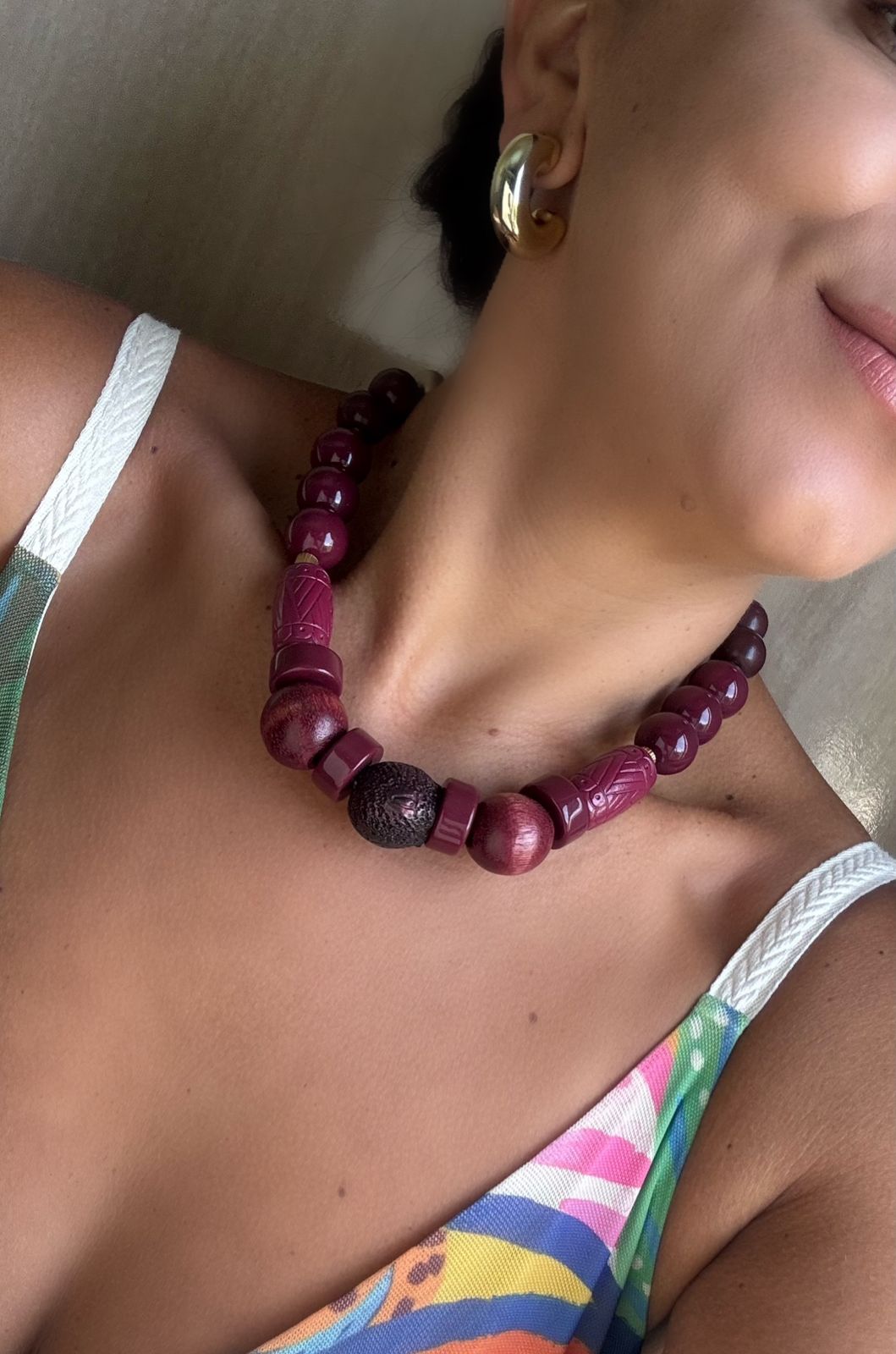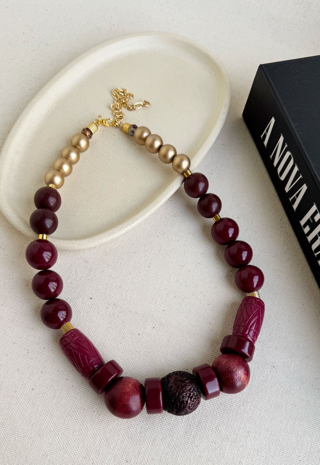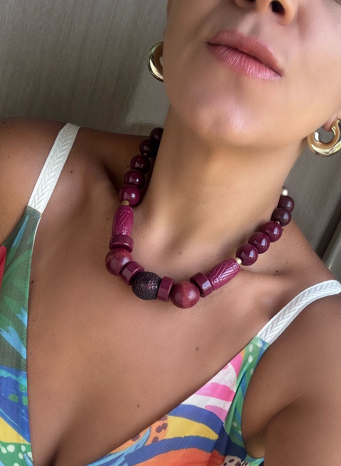 Colar de Resinas Variadas – Tons De Bordô e Acabamento Dourado