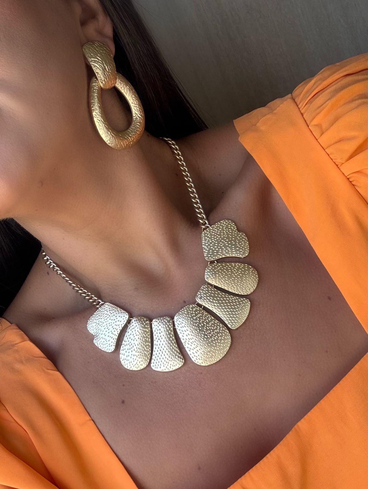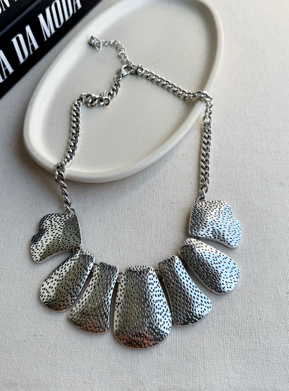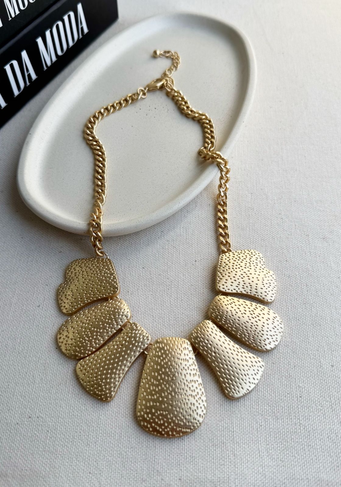 Este colar maxi de placas texturizadas é uma peça imponente e sofisticada, perfeita para mulheres que desejam transmitir estilo e personalidade em qualquer ocasião. Seu design é composto por placas em metal cuidadosamente trabalhadas em relevo, que criam um efeito elegante e moderno, destacando-se como um acessório marcante no colo. A corrente de elos médios garante resistência e conforto, enquanto o fecho ajustável permite adaptar a altura conforme a preferência.