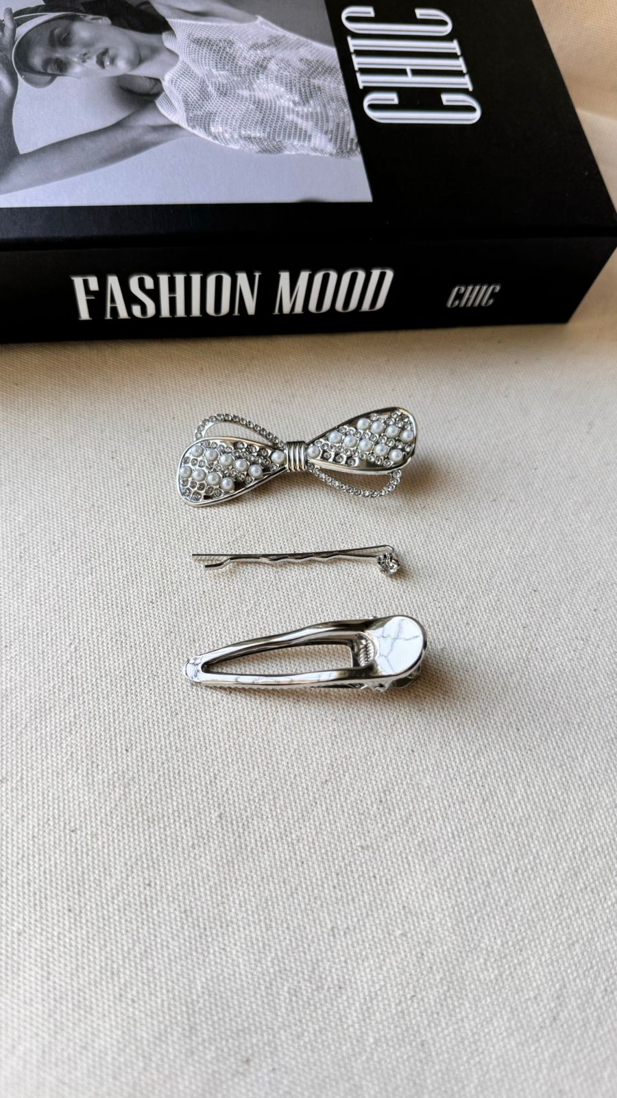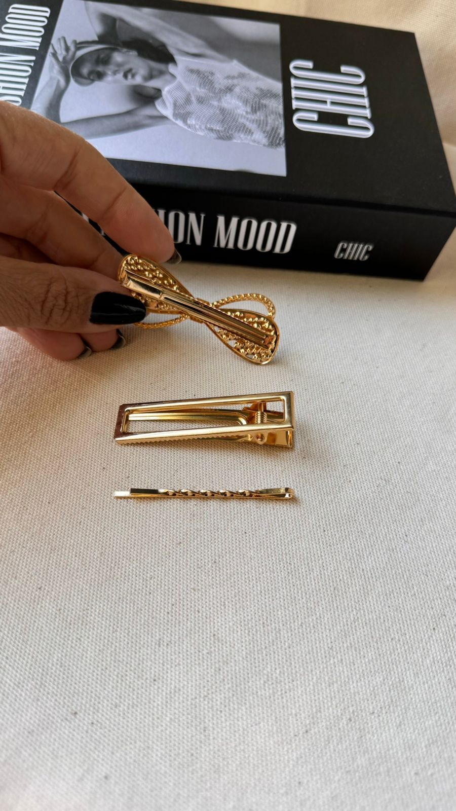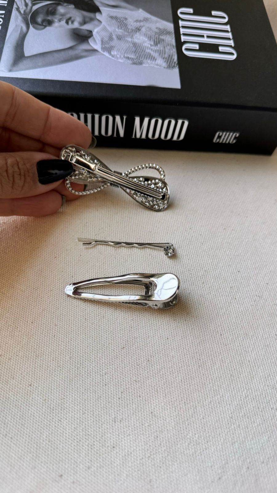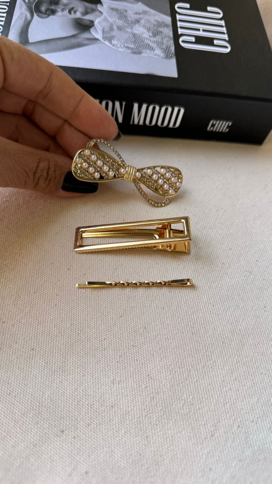 Kit com mini presilhas sendo uma quadrada e outra de Laço com detalhe de Strass e Pérola. Todo em metal com banho Dourado ou Níquel.