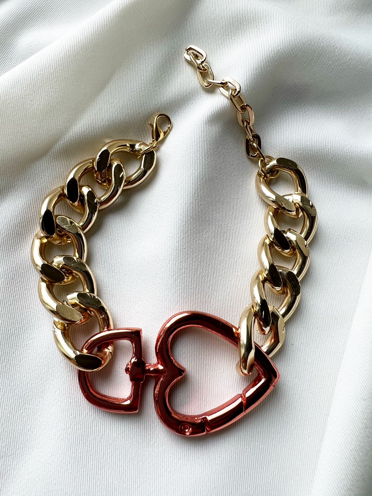 Pulseira de corrente Dourada com detalhe de fecho Fake, todo de aluminio. E acabamento em corrente alongadora com 13,5 cm de comprimento.